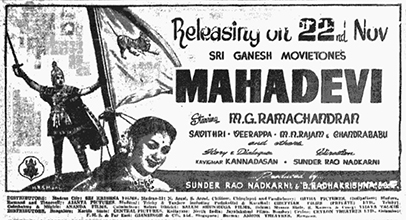 ‘மகாதேவி’ படத்தில் மகாதேவியாக சாவித்திரி நடித்திருப்பார். முதல் காட்சியில் சோழர்கள் ஒரு நாட்டினைக கைப்பற்றுகிறார்கள் என்பதாக தொடங்கும். வல்லபன் என்கிற கதாபாத்திரத்தில் எம்ஜிஆர் சோழ நாட்டின் சேனாதிபதியாக நடித்திருப்பார். கைப்பற்றப்பட்ட்ட நாட்டின் இளவரசி சாவித்திரி. சாவித்திரி வாள் சண்டை இடும் காட்சியில் தான் படம் தொடங்கும்.