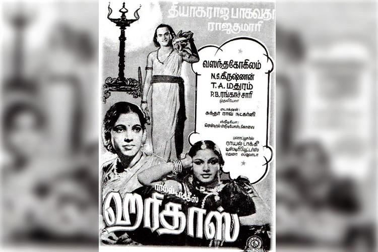 ‘ஹரிதாஸ்’ படத்தின் கதை ‘ஸ்ரீ பக்த விஜயம்’ என்கிற நூலில் இருந்து எடுத்தாளப்பட்டது. இந்த நூலானது கிருஷ்ணரின் வெவ்வேறு விதமான பக்தர்களைப் பற்றி சொல்கிறது. பெரும்பாலும் வடநாட்டில் உள்ள பக்திப் பாடல்களை புனைந்தவர்கள் பற்றிய கதைகள் கொண்ட புத்தகம். துக்காராம், மீரா, கபீர் தாஸ், சூர்தாஸ் போன்றவர்களைப் பற்றியது. எல்லோருமே எளிமையான வாழ்க்கையை வாழ்ந்து கிருஷ்ணர் மீது கொண்ட பக்தியினால் கிருஷ்ணரை நேரில் தரிசனம் செய்தவர்களாக சொல்லப்படுபவர்கள். இந்தப் புத்தகத்தின் பாதிப்பில் இருந்தே இதே போன்ற ஒரு கதையை இளங்கோவன் என்பவர் எழுதுகிறார். அதற்குத் திரைக்கதை வடிவம் கொடுத்து ‘ஹரிதாஸ்’ படமாக எடுக்கிறார் சுந்தர் ராவ். ஏற்கனவே ‘சாந்தா சக்குபாய்’ படத்தினை இதே போன்ற களத்தை மையமாகக் கொண்டே இயக்கினார். இது போன்ற பக்தர்களின் கதைகள் அதற்கு முன்பும் தமிழ்த்திரையுலகில் அதிகம் வந்திருக்கின்றன. கதை புதிதில்ல. ஆனால் திரைக்கதை புதிது.